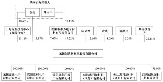 截至目前,创达新材的实控人为张俊和陆南平。其中,张俊和陆南平二人合计直接和间接控股51.87%。张俊目前任创达新材的董事长兼总经理,陆南平任公司副董事长兼副总经理。