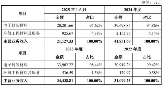 电子封装材料是创达新材的主要产品和主要收入来源,2022年—2024年及2025年上半年,该业务分别实现收入3.09亿元、3.39亿元、3.97亿元和2.02亿元,分别占比99.42%、98.44%、94.86%和95.62%。